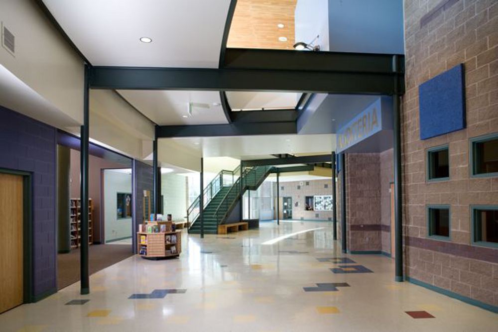 The New Roaring Fork High School is located in Carbondale, Colorado at the confluence of the Crystal and Roaring Fork Rivers. Mount Sopris separates each river and is Carbondale’s mountain. Rising 6,008 vertical feet straight up from the valley floor; it dominates views, influences weather, and was a design imperative. Teaching spaces are grouped into 3 small, interdisciplinary learning neighborhoods. Each neighborhood contains 4 generic classrooms, a science lab and an enclosed, small group room. The neighborhoods are focused internally on a communal living room for socialization and large group gatherings and presentations. Circulation spaces are designed with nooks and eddies to encourage informal gathering, tying the academic neighborhoods to the Commons and Library with a 2 story Gallery. The 3 pod, interdisciplinary neighborhood design prevents the 4 grade school from devolving into a traditional grade-level configuration, stretching the educator’s mind to … think outside the box. Two story classroom wings conserve ground space and straddle the Sopris-axis of the Auditeria and Library with a sweeping bridge connection. The bridge and Gallery below funnel students and visitors alike past the open “Library as the heart of the school”.